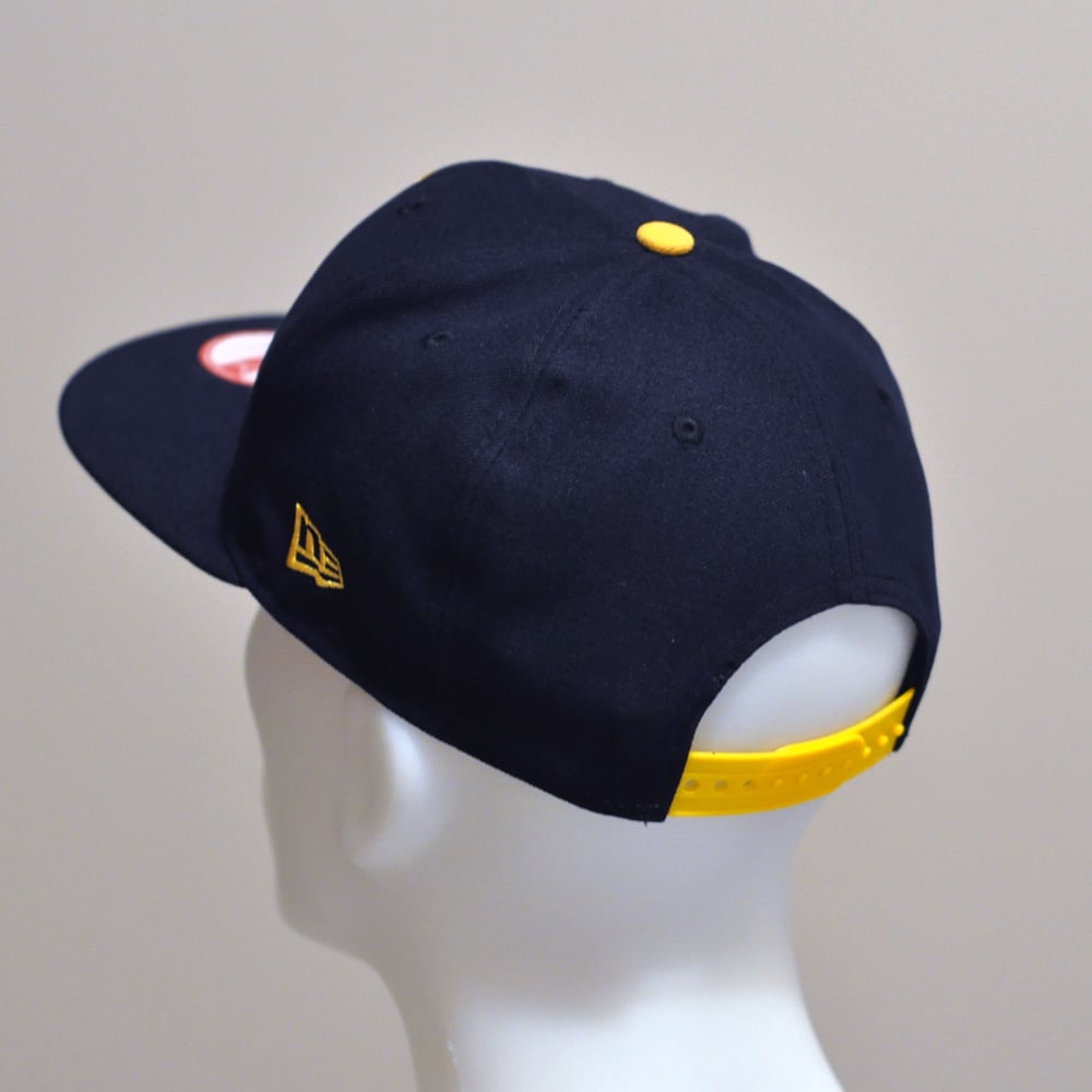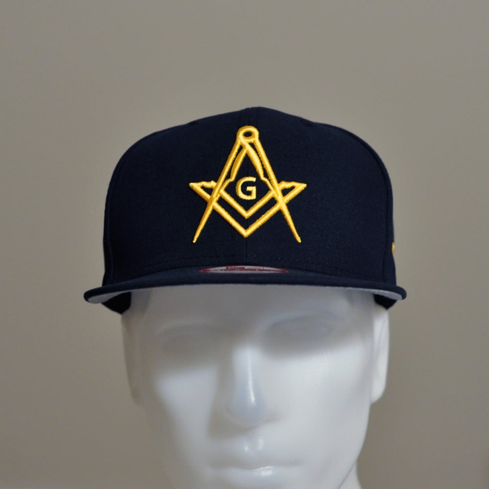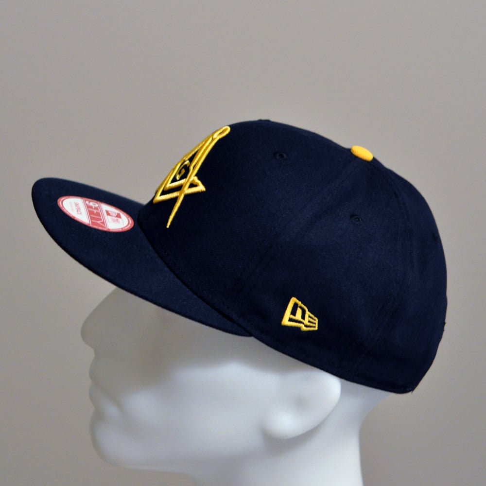 Here we have another snap-back. This comes in a dark navy with bold, golden yellow embroidery. Large raised 3D square and compass w/G embroidered on the front. New Era flag on the side, and with a matching button and adjustable snap back enclosure. A classic colorway!